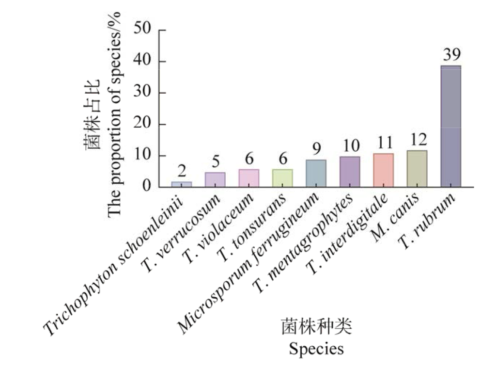 评估皮肤癣菌对9种抗真菌药的体外抗真菌药物敏感性特征。收集2010年至2023年间保存于新疆医科大学第一附属医院皮肤科真菌实验室的153株皮肤癣菌,菌种鉴定采用形态学结合分子生物学方法,体外抗真菌药敏试验参照微量液基稀释法测定特比萘芬、阿莫罗芬、卢立康唑、两性霉素B、环吡酮胺、伊曲康唑、伏立康唑、灰黄霉素、氟康唑9种抗真菌药物的最低抑菌浓度(MIC)值。共鉴定出9种皮肤癣菌包括红色毛癣菌59株(39%)、趾间毛癣菌17株(11%)、须癣毛癣菌15株(10%)、断发毛癣菌9株(6%)、疣状毛癣菌8株(5%)、紫色毛癣菌9株(6%)、许兰毛癣菌3株(2%)、犬小孢子菌19株(12%)和铁锈色小孢子菌14株(9%)。体外药敏结果显示所有皮肤癣菌对卢立康唑体外抗菌活性最强,MIC值范围为0.000 5-0.004 μg/mL;伊曲康唑(MIC:0.004-1 μg/mL)、伏立康唑(MIC:0.004-0.5 μg/mL)、特比萘芬(MIC:0.000 125-0.25 μg/mL)、阿莫罗芬(MIC:0.004-1 μg/mL)及环吡酮胺(MIC:0.063-4 μg/mL)体外抗菌活性较强。灰黄霉素(MIC:0.016-32 μg/mL)与两性霉素B (MIC:0.032-16 μg/mL)体外抗菌活性较弱;氟康唑体外抗菌活性最弱,MIC范围为0.125-64 μg/mL,其中2株铁锈色小孢子菌与1株紫色毛癣菌对氟康唑的MIC值>64 μg/mL。所有的皮肤癣菌中,卢立康唑、特比萘芬等药物体外抗菌活性很强,氟康唑和两性霉素B活性最弱且出现耐药菌株。