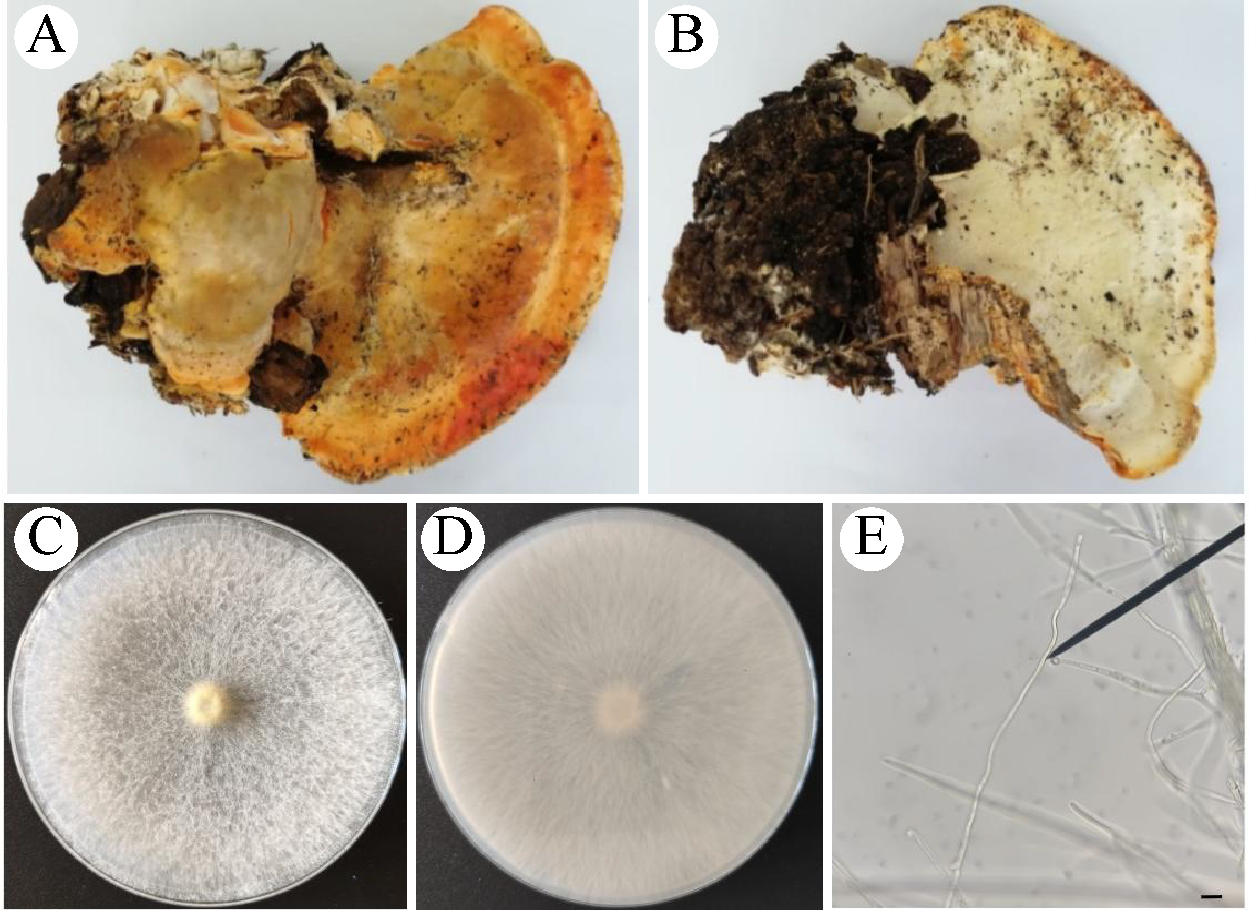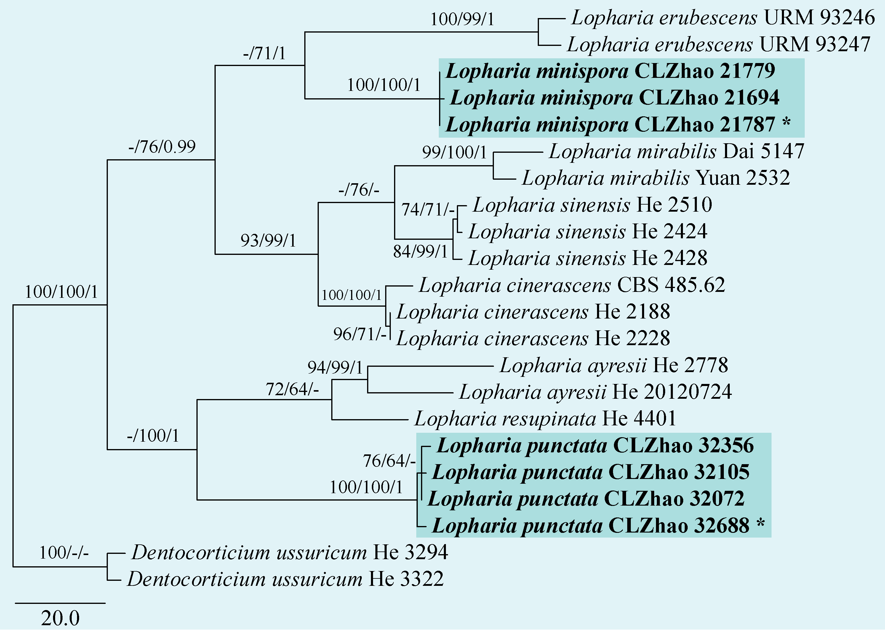 木腐真菌作为森林生态系统中的分解者发挥着关键作用。本研究基于形态学和分子系统学证据描述并绘制了来自中国云南省的2个木腐真菌新种:小孢脊革菌Lopharia minispora和斑点脊革菌Lopharia punctata。L. minispora的形态特征为革质担子果,具浅棕色有裂纹的子实层体,菌丝系统一体系具锁状联合,担孢子窄椭圆形,大小为5.5-6.7 × 2.7-3.3 µm;L. punctata的形态特征为膜质担子果,具白色至奶油色的子实层体,菌丝系统一体系且生殖菌丝具简单分隔,担孢子近球形至球形,大小为9.5-12 × 7.5-10.1 µm。研究采用最大似然法、最大简约法和贝叶斯推断法对研究标本的ITS+nLSU rDNA基因序列进行系统发育分析,分析表明2个新物种隶属于Lopharia,其中L. minispora与Lopharia erubescens聚为姐妹种,L. punctata与Lopharia ayresii和Lopharia resupinata支系为近缘类群。
