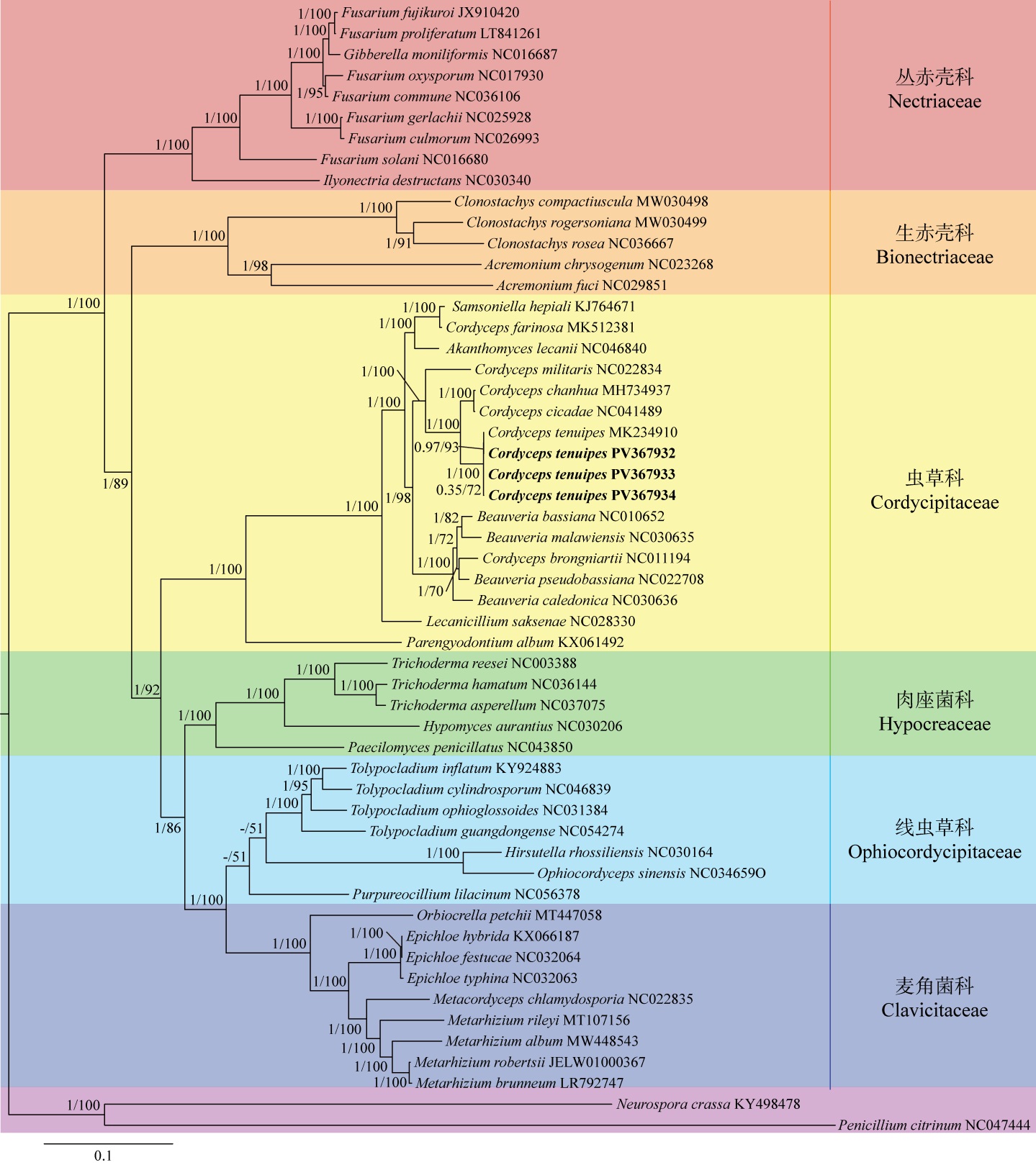 细脚虫草Cordyceps tenuipes是具药用价值的虫生真菌之一。本研究通过对3个采集地的细脚虫草YFCCYY01 (中国昆明)、YFCCTL09 (泰国清迈)、YFCCDT06 (越南林同)的线粒体进行测序、组装和注释,发现3株细脚虫草线粒体基因组为闭合环状,大小分别为40 752、48 187、32 385 bp,共编码42个基因,包括15个蛋白质编码基因(PCGs)、2个核糖体(rRNA)基因和25个转运RNA (tRNA)基因。13个PCGs的起始密码子和终止密码子均是AUG和UAA,nad3和rps3的起始密码子和终止密码子则均为AUG和UAG,偏好密码子均为UUA。在14个PCGs中氨基酸使用频率差异较大,其中亮氨酸使用频率最高。25个tRNA基因可转运全部20种氨基酸,其中20个tRNA基因二级结构为三叶草结构。通过构建肉座菌目6科51个物种的系统发育树,确定细脚虫草属于肉座菌目Hypocreales、虫草科Cordycipitaceae、虫草属Cordyceps。对虫草科线粒体基因组进行共线性分析,发现14个物种存在4个同源区,同源区域A最长。与其他虫草科物种相比,细脚虫草线粒体基因组偏大,同源区域相对较长。通过研究细脚虫草线粒体基因组可以确定其系统发育位置,鉴别其物种特异性。以3个地方的细脚虫草做研究,分析线粒体基因组在不同地理位置上的差异,为后续细脚虫草的开发利用提供依据。