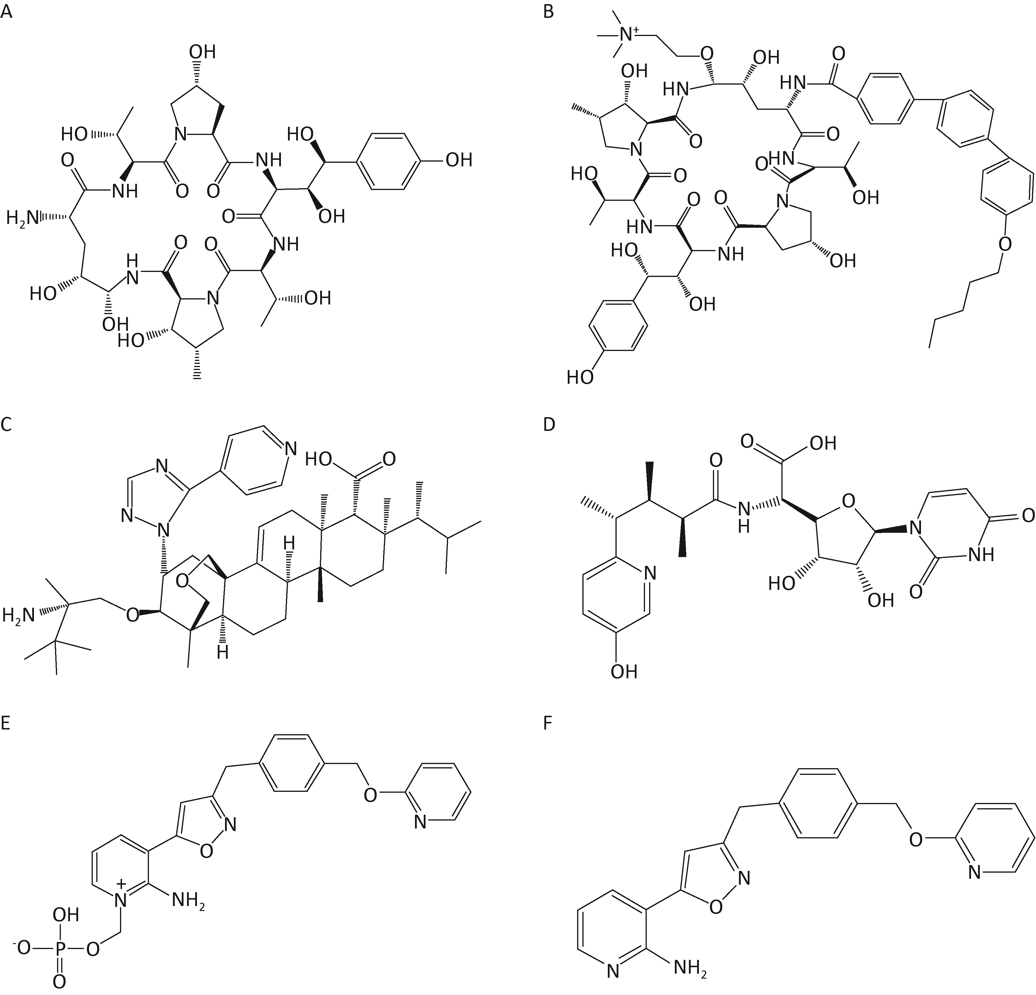 | Fig. 2 Chemical structures of anti-IFIs fungal drugs targeting fungal cell wall. A: Echinocandin; B: CD101; C: SCY-078; D: Nikkomycins Z; E: APX001; F: APX001A. |