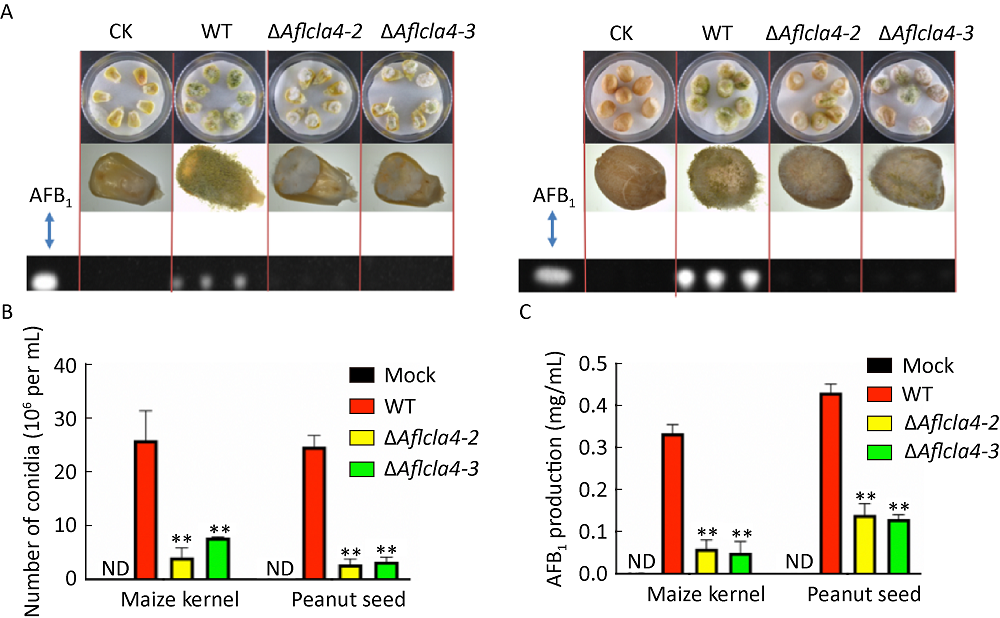 | Fig. 8 Effects of Aflcla4 on pathogenicity of Aspergillus flavus to peanuts and maize. A: Phenotype analysis of WT and gene deletion strains cultured on peanuts and maize at 29°C in dark for seven days; B: Quantitative analysis of conidia collected from infected crop seeds; C: Thin-layer chromatography analysis of aflatoxin production in infected crop seeds. Asterisks indicate significant differences between the wild-type and other strains (**P≤0.01). |