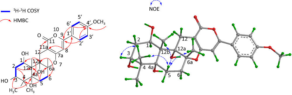 图2. 化合物1的关键1H-1H COSY、HMBC和NOE相关 |