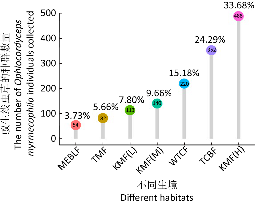| 图2 不同生境蚁生线虫草的分布规律 KMF(H):石灰岩山季雨林高海拔样地;KMF(M):石灰岩山季雨林中海拔样地;KMF(L):石灰岩山季雨林低海拔样地;TMF:热带季雨林;MEBLF:季风常绿阔叶林样地;TCBF:热带丛生竹林样地;WTCF:暖热性针叶林样地. 下同 |