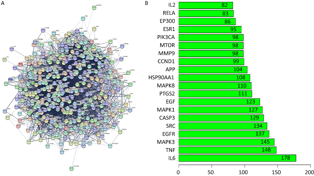 | Fig. 3 Protein-protein interaction network. A: PPI network of the common target genes; B: Frequency of the top 20 target genes. |