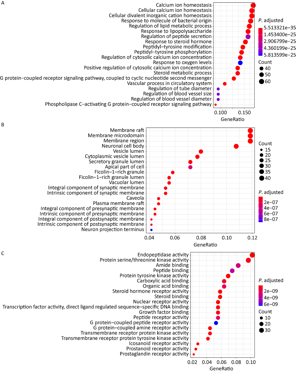 | Fig. 4 GO enrichment analysis (top 20). A: Biological processes; B: Cellular components; C: Molecular functions. |