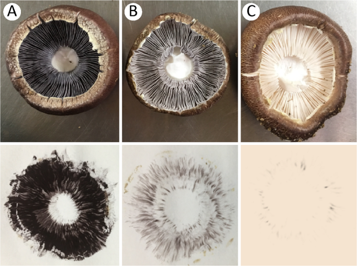 Grayish black, greyish white and pure white gills of Stropharia rugosoannulata and their spore print.