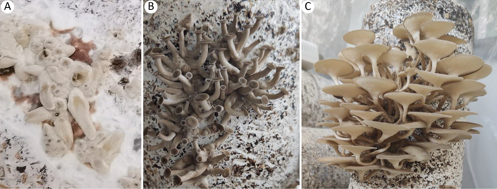 | 图4 漏斗多孔菌子实体形成过程 A:子实体原基形成;B:菌柄伸长生长及菌盖分化;C:子实体发育成熟 |