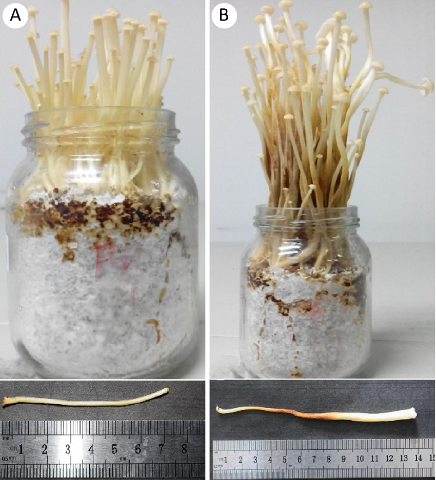 | Fig. 1 Stipes of Flammulina filiformis. A: Elongation stage; B: Mature stage. |
