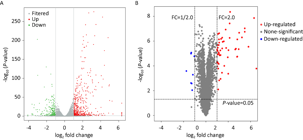 | 图3 差异表达基因和蛋白分布火山图 A:差异表达基因;B:差异表达蛋白 |