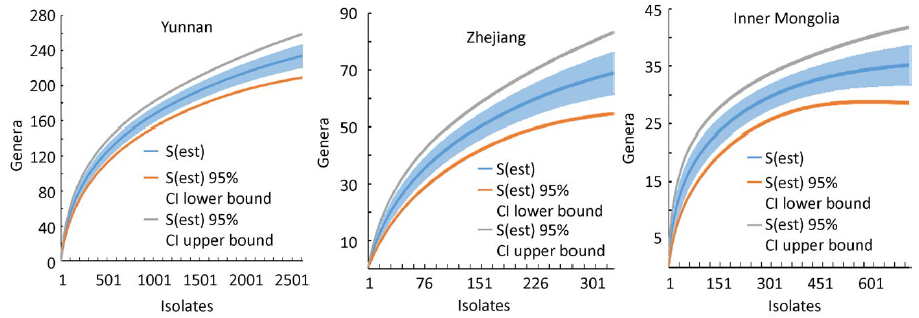| Fig. 4 Accumulation curves of endophytic fungi from gramineous plants in Yunnan, Zhejiang and Inner Mongolia. |