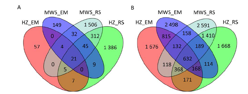 | 图1 真菌(A)和细菌(B)OTU数量关系 |