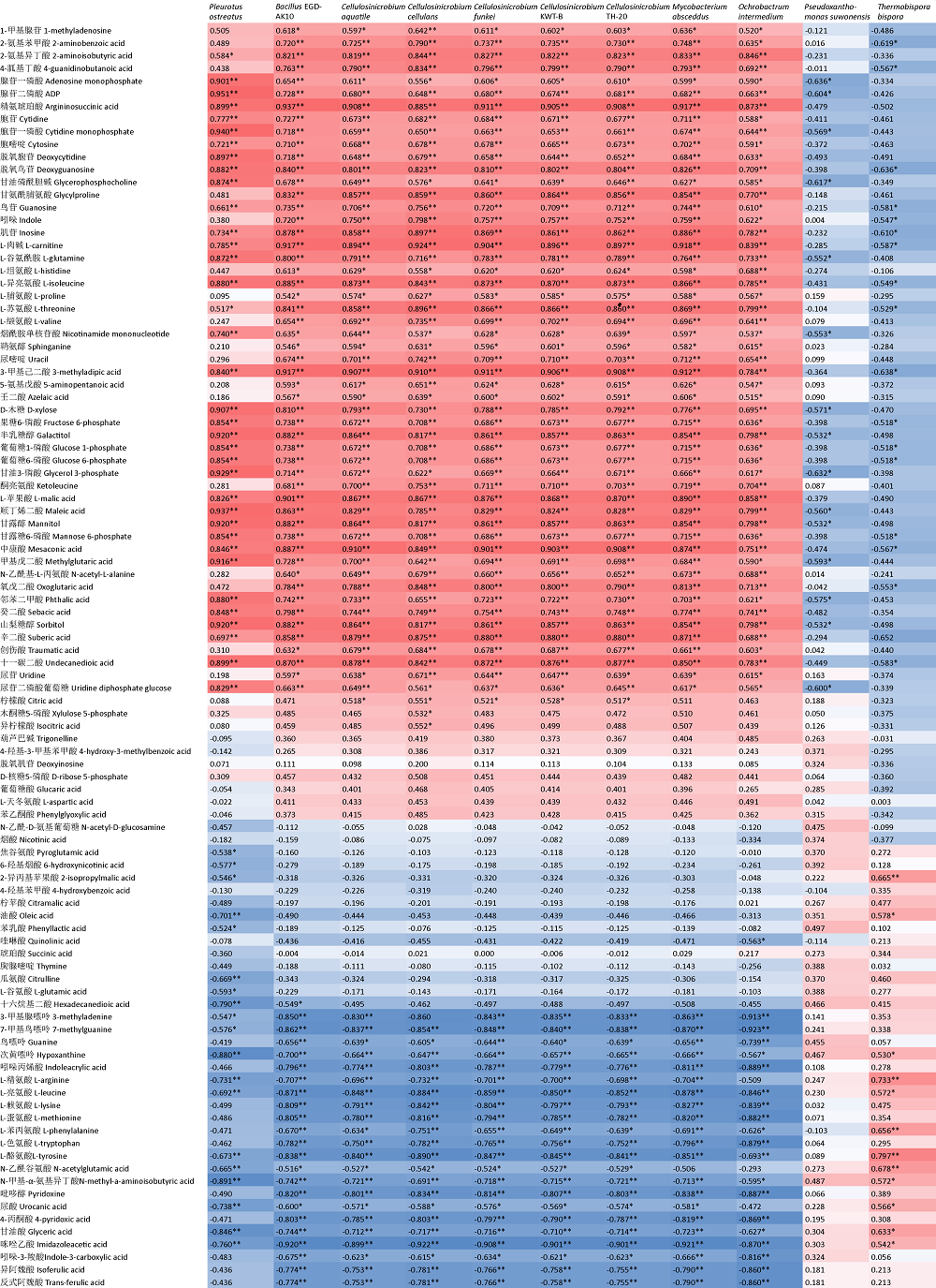 | 图8 代谢物含量与特定物种相对丰度之间的Pearson相关系数 *P<0.05,**P<0.01 |
