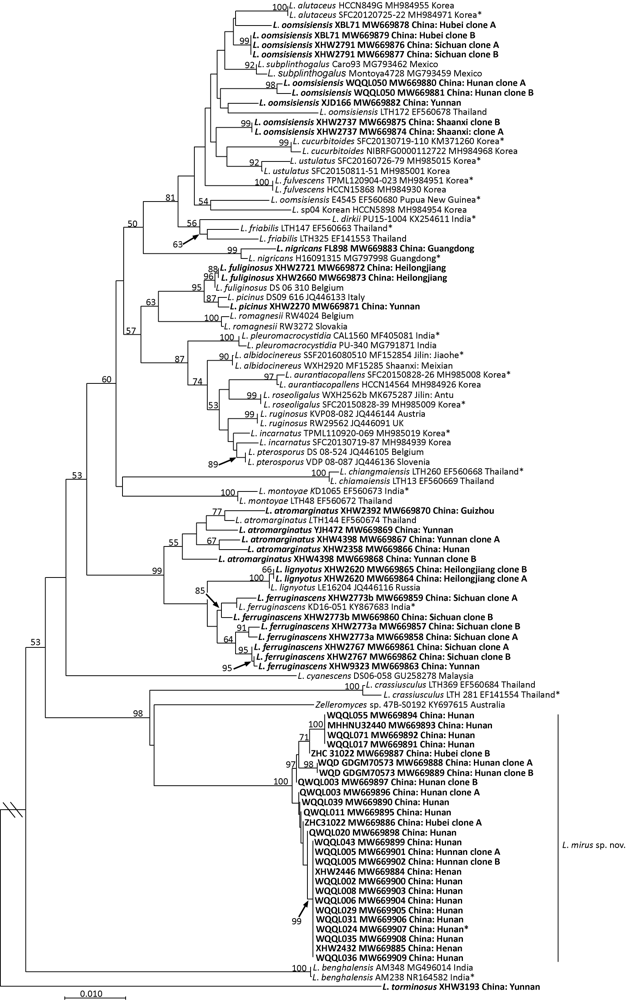 Four hits of ITS sequences were obtained from GenBank using BLASTn. These data involved one Thai species L. crassiusculus H.T. Le & D. Stubbe and one Australian hypogeous sample/taxon of Zelleromyces. Published ITS and LSU (if available) sequences of 19 Asian species were included: L. albidocinereus X.H. Wang et al., L. alutaceus H. Lee et al., L. atromarginatus Verbeken & E. Horak (=L. lavandulus H.T. Le & D. Stubbe), L. aurantiacopallens H. Lee et al., L. chiangmaiensis (H.T. Le & D. Stubbe) Montoya et al., L. crassiusculus H.T. Le & D. Stubbe, L. cucurbitoides H. Lee & Y.W. Lim, L. dirkii P. Uniyal et al., L. ferruginascens K. Das et al., L. friabilis H.T. Le & D. Stubbe, L. fulvescens H. Lee et al., L. incarnatus H. Lee et al., L. montoyae K. Das & J.R. Sharma, L. nigricans G.S. Wang & L.H. Qiu, L. oomsisiensis Verbeken & Halling, L. pleuromacrocystidiatus P. Uniyal et al., L. roseoligalus X.H. Wang (=L. alboroseus H. Lee et al.), L. ustulatus H. Lee et al. and an unnamed taxon “L. sp4” in Lee et al. (2019). These sequences were published in Le et al. (2007), Stubbe & Verbeken (2012), Lee et al. (2015), Hyde et al. (2016), Das et al. (2017), Shi et al. (2018), Lee et al. (2019), Wang et al. (2019) and Uniyal et al. (2019). In addition, 27 ITS and 18 LSU sequences generated from 18 Chinese specimens of L. albidocinereus, L. atromarginatus, L. ferruginascens, L. fuliginosus, L. lignyotus, L. nigricans and L. oomsisiensis by this study were included.