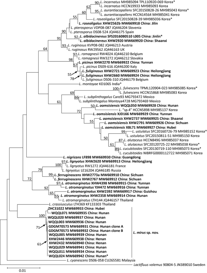 Original tree generated by neighbor-joining (NJ) analysis of Lactarius mirus and its relatives using LSU sequence data, rooted with Lactifluus volemus. NJ bootstrap proportions higher than 50% are indicated above the branches. Sample labels are provided in the order of species name, strain, GenBank accession and geographical origin. For Chinese samples, province and county names are given. Type specimens are marked with an asterisk. Sequences generated in this study are in bold.
