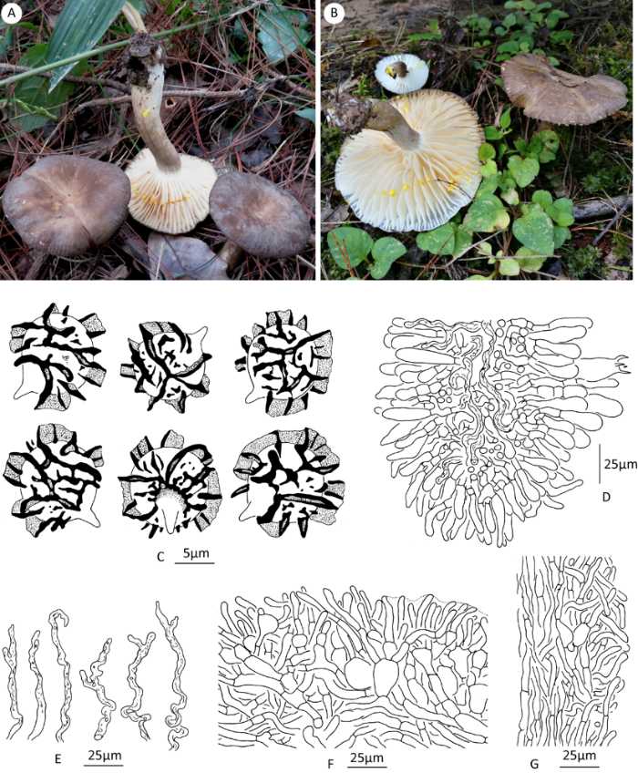 Basidiocarps and microscopic drawings of Lactarius mirus. A, C and F from holotype; B, D, E and G from KUN-HKAS112558. A, B: Basidiocarps; C: Basidiospores (holotype); D: Lamellar edge; E: Hymenophoral pseudocystidia; F: Pileipellis; G: Stipitipellis.