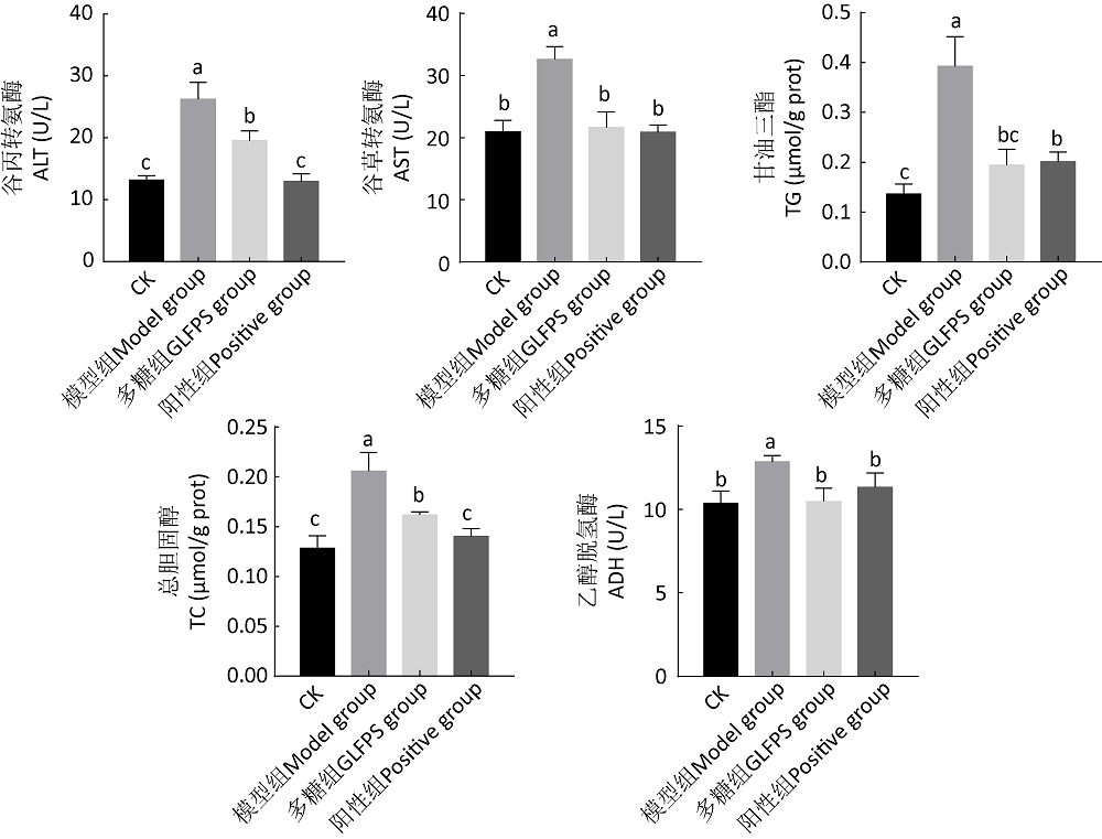 | Fig. 1 Levels of AST, ALT, TG, TC, and ADH in serum of mice. Small letters a, b and c indicate the significance of the difference at the level of 0.05. The same below. |