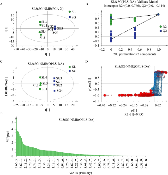 将1H-NMR和GC-MS积分数据分别矩阵导入SIMCA-P 14.1 (Umetrics,Umea,Sweden)软件,对数据进行中心化和规格化之后进行主成分分析(principal component analysis,PCA)和最小二乘法显著性分析(PLS-DA)来观察样本之间的总体分布和区分各组样本代谢轮廓的总体差异,通过正交偏最小二乘法判别分析(orthogonal PLS-DA,OPLS-DA)中变量权重值(variable importance in projection,VIP)大于1的组分和相关系数标注的载荷图中|P|>0.02和|P(corr)|>0.5的区域来确定差异变量。对差异变量进行定性和内标归一化定量后,采用统计分析软件SPSS 25进行方差分析,显著性分析采用t检验,其中P值小于0.05的组分被认为是具有显著性差异物质,P值小于0.01的组分认为是具有极显著性差异的物质。
