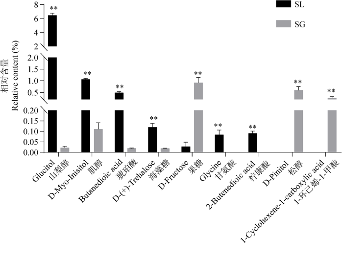 基于1H-NMR技术的中国块菌和松根之间差异代谢产物的相对含量 SL:中国块菌;SG:松根. ** P<0.01