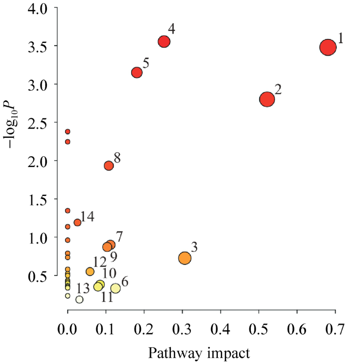 中国块菌和松根之间差异代谢物的代谢通路分析 1:淀粉和蔗糖代谢;2:丙氨酸、天冬氨酸和谷氨酸代谢;3:甘氨酸、丝氨酸和苏氨酸的代谢;4:乙醛酸和二羧酸代谢;5:精氨酸生物合成;6:嘌呤代谢;7:精氨酸和脯氨酸的代谢;8:三羧酸循环(TCA循环);9:谷胱甘肽代谢;10:苯丙氨酸、酪氨酸和色氨酸的生物合成;11:甲烷代谢;12:硫代谢;13:半胱氨酸和蛋氨酸代谢;14:半乳糖代谢