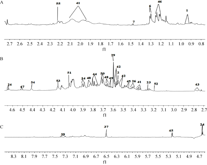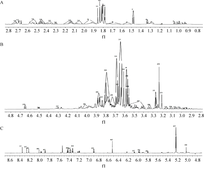 本实验室前期通过水、甲醇、丙酮、氯仿、水与甲醇(1:1)、水与丙酮(1:1)、水与氯仿(1:1)、水+氯仿+甲醇(1:2:1) 8种溶剂的初筛实验表明,水提取出来的化合物种类较多,所以本实验室1H-NMR用水作为提取溶剂。具体提取方法见1.3.2,加入的8种溶剂分别为1 mL D2O、1 mL MeOD、1 mL C3D6O、1mL CDCl3、500 μL MeOD+ 500 μL D2O、500 μL C3D6O+ 500 μL D2O、500 μL CDCl3+ 500 μL D2O、1 mL CDCl3+ 500 μL D2O+ 500 μL MeOD。