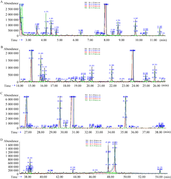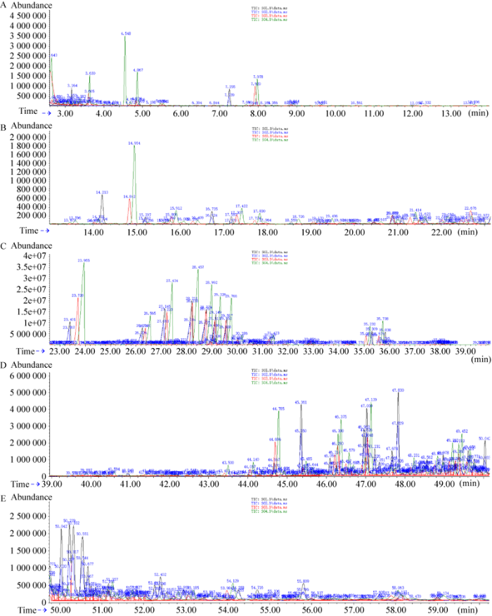 将所有的GC-MS原始数据(Raw格式)通过Agilent工作站导出为net CDF格式。将net CDF格式的GC-MS图谱导入XCMS-online进行峰提取、峰对齐、切割、滤噪代谢特征提取等预处理,去除柱流失、样品制备过程中的杂质峰等外界因素的干扰后,导入Excel中对数据进行归一化。