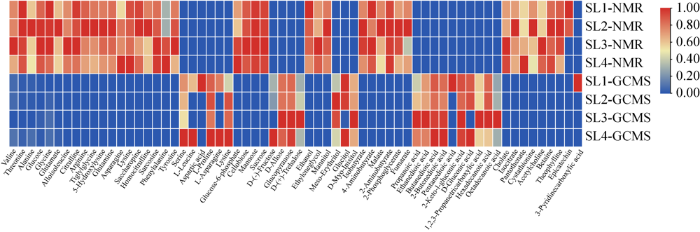 原始谱图背景扣除,保留时间校正和AMDIS软件解卷积分(除噪、峰匹配)操作再结合NIST (2014),PBM标准谱库,HMDB数据库(http://www.hmdb.ca/),标准品对代谢物逐一进行检索和定性。用匹配物质的峰面积值/内标峰面积值来表征该物质的含量,做相对定量分析,并用TBtools软件进行含量热图绘制。