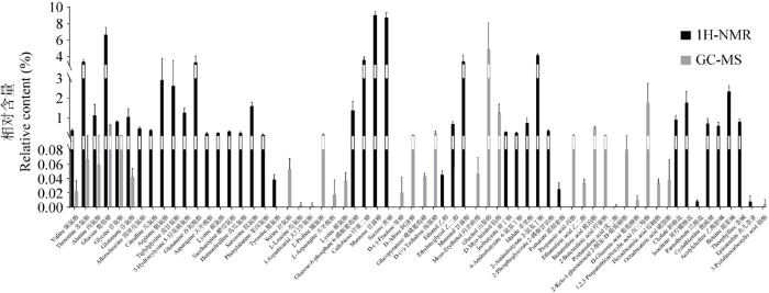 本研究同时利用1H-NMR和GC-MS两种方法对中国块菌及其共生的松根进行了小分子活性代谢物的检测,在块菌中分别指认出了40和30个物质,可见1H-NMR检测到的物质相对多于GC-MS。总体上两种方法互为补充,扩大了检测效果。但由于提取方法的多样性及数据库的完整性等,提取到的化合物不够全面,大部分峰谱尚难以识别,后续可以进一步结合LC-MS技术,进行更加系统性及完整性的分析。
