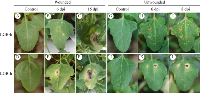 本研究共分离得到21株病原菌,依据在各培养基上的菌落形态特征(颜色、质地等)分为2类,选取LGB-b和LGB-h作为代表性菌株进行系统性研究。代表性菌株在4种鉴别培养基上气生菌丝发达呈绒毛状或棉絮状,菌落正面黄棕、灰棕或深绿色,背面棕、灰褐或黑褐色。