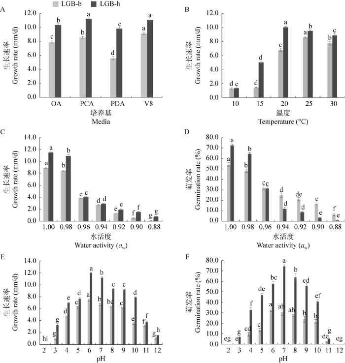 国内外研究学者发现A. alternata尽管在种上一致,但在种内存在明显的生物学上的差异,如分离自高粱的A. alternata在中性条件下生长最好(赵艳琴等 2021),分离自玉米的A. alternata喜欢中性偏碱的环境(王媛媛等 2015)。本研究发现菌株LGB-b和LGB-h在弱酸条件下(pH为6-7)生长最好;菌株LGB-b的分生孢子更偏好弱酸环境(pH为6-7),而LGB-h的分生孢子在弱碱环境萌发率更高(pH为7-8)。温度对菌株LGB-b和LGB-h有显著影响,LGB-b在温度偏高时(25-30 ℃)生长较快,而菌株LGB-h适宜生长的温度相对冷凉(20-25 ℃)。水活度对病原菌的生长、繁殖及孢子的存活有重要意义。本研究发现水活度对菌株LGB-b和LGB-h的分生孢子萌发有显著影响,菌株LGB-b的分生孢子在较低的自由水环境中萌发率较高(水活度≤0.94),表明其适应性更广。不同的A. alternata菌株间在温度、pH、致病力等方面存在差异的原因可能与病原菌的寄主和采集地不同有关。