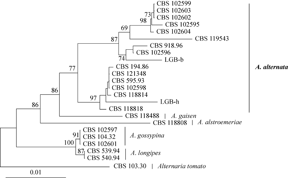 Fig. 4. Phylogenetic tree based on Alt a 1, endoPG, and OPA10-2 genes of isolates LGB-b and LGB-h, and their related strains. |