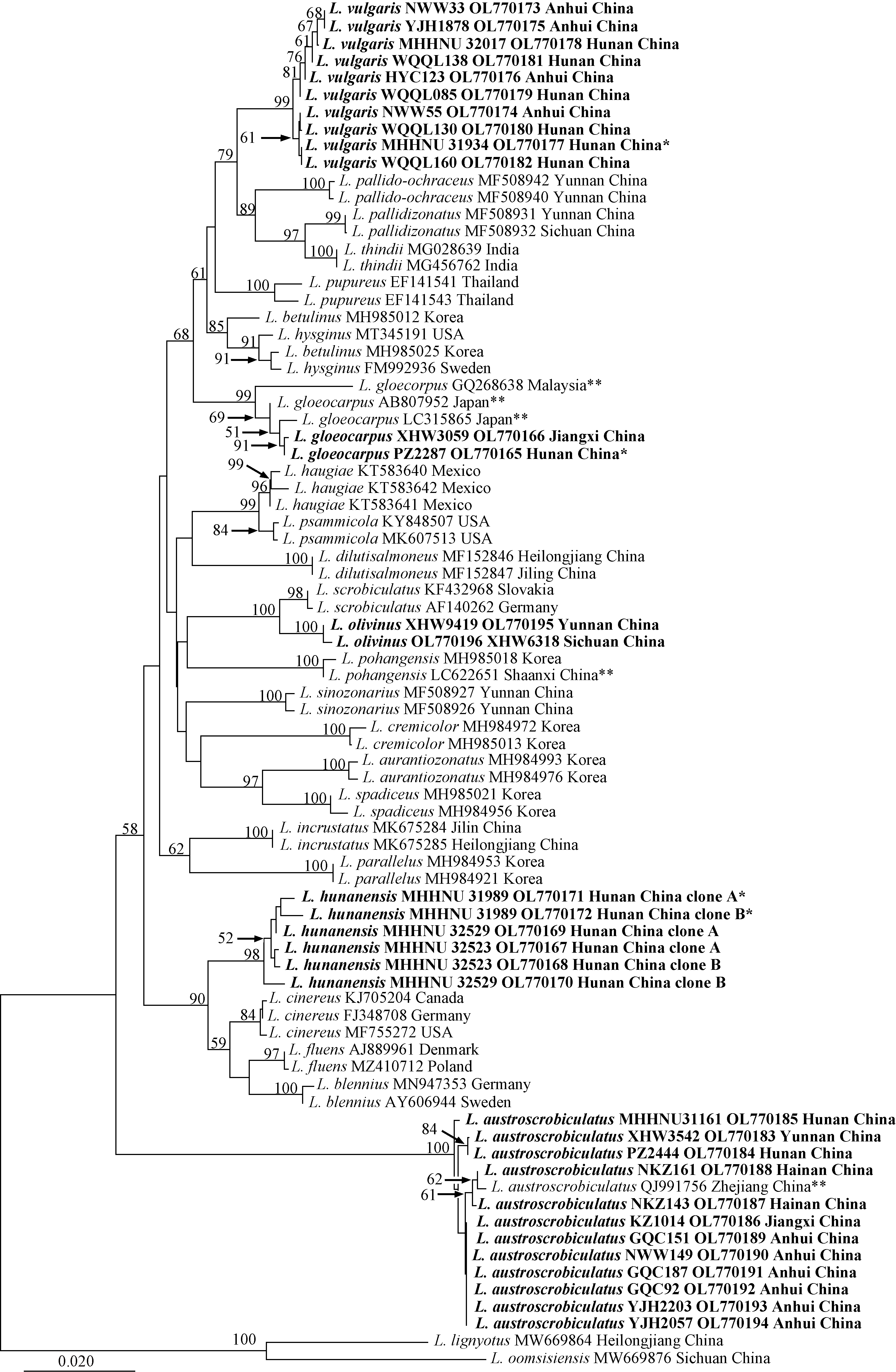 | Fig. 1 Original tree generated by neighbor-joining (NJ) analysis of Lactarius subg. Lactarius based on ITS sequences rooted with L. lignyotus and L. oomsisiensis. NJ bootstrap proportions higher than 50% are indicated above the branches. Sample names are presented in the order of species name, voucher specimen, GenBank accession, and geographical origin for the new species and new record. For the known species, voucher specimen information is left out. For Chinese samples, the province name is given. Type specimens are marked with an asterisk, and those from environmental samples are marked with two asterisks. Sequences generated in this study are in bold. |