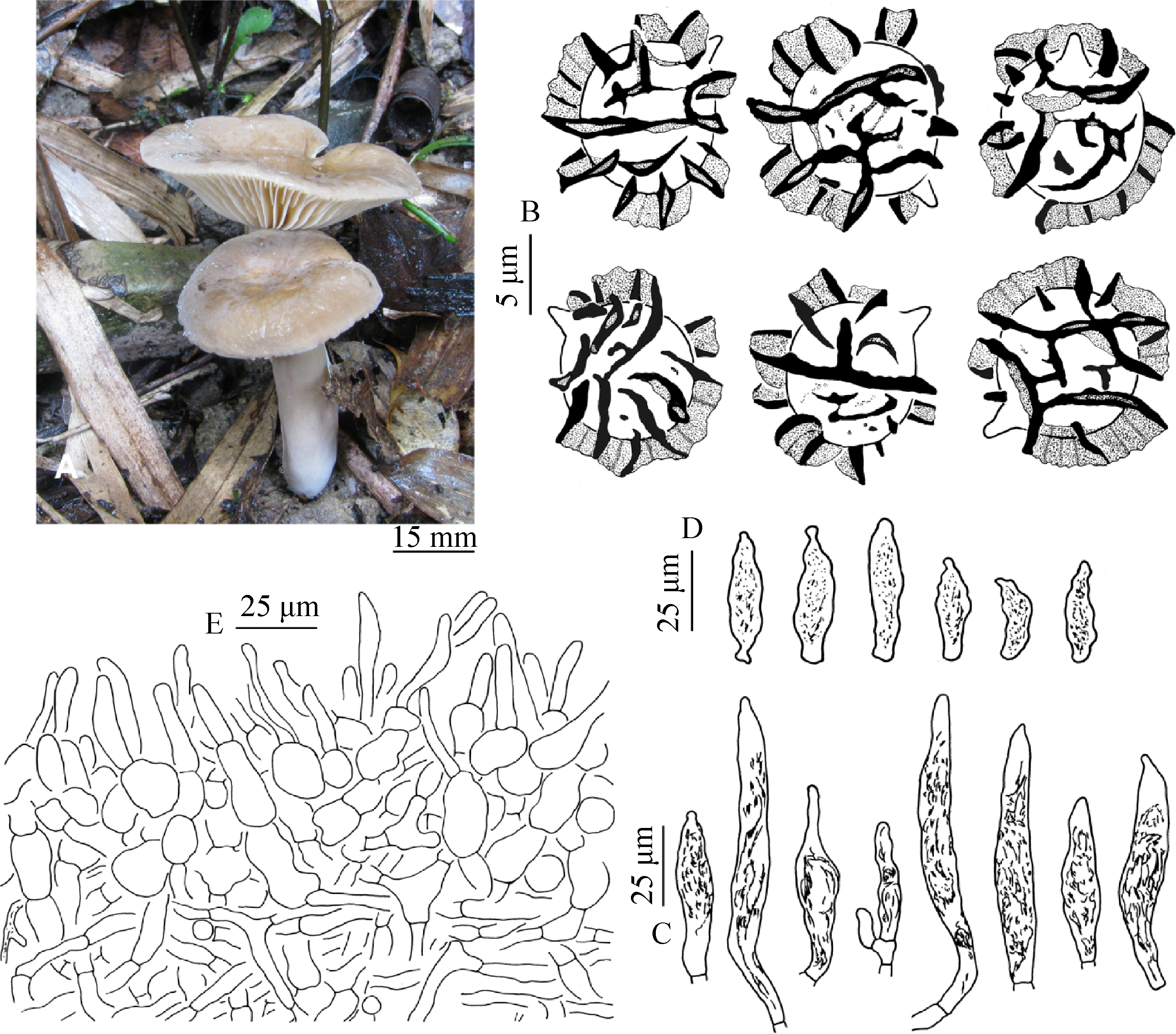 | Fig. 8 Lactarius polycystis (MHHNU 30481, holotype). A: Basidiocarps; B: Basidiospores; C: Pleuromacrocystidia; D: Cheilomacrocystidia; E: Pileipellis. |