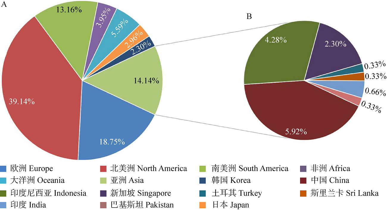 | 图1 全球已报道广义金钱菌属物种新种在各大洲的分布及其中报道自亚洲的新种在各国的分布 A:全球各大洲广义金钱菌属物种新种报道比例. B:亚洲各国报道广义金钱菌属新种物种比例 |