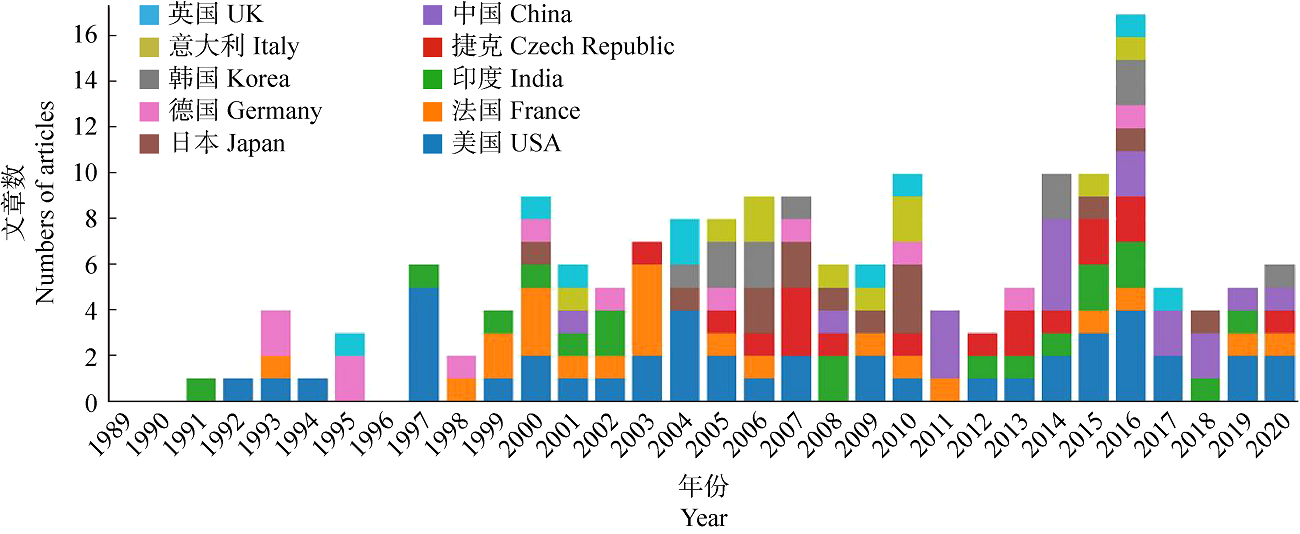 | 图3 1989-2020年Web of Science中收录的广义金钱属真菌文章年发文量统计 |