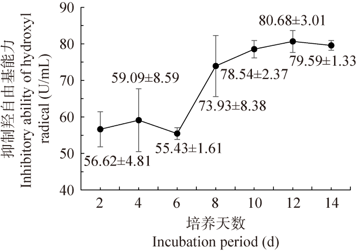 羟自由基(·OH)是一种能够刺激油脂发生过氧化反应且广泛存在于机体内的强氧化剂,会破坏生物膜的结构和功能,是目前已知对生物体危害最大的自由基。粗毛纤孔菌在初始2-6 d内抑制羟自由基能力变化不大,保持在55 U/mL以上,但是自第8天起开始迅速升高进而趋于平稳状态(图9),并在第12天达到最大值(80.68±3.01) U/mL,说明该菌株在一定条件下可以达到很强的抗氧化能力。