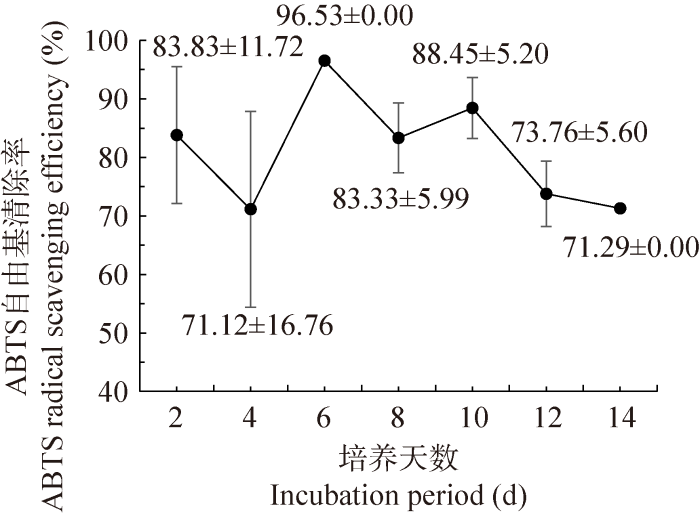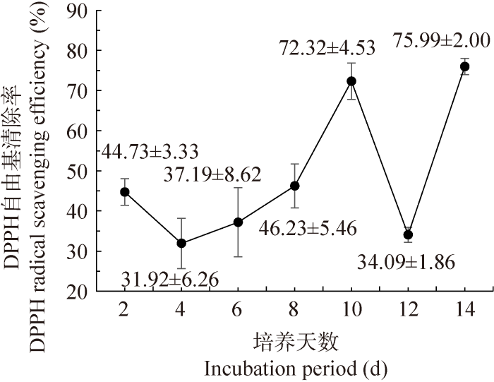 DPPH自由基(二苯代苦味酰基自由基)在有机溶剂中能够一直处于稳定状态,因此DPPH法以其简单、快速和灵敏等优点被广泛应用于抗氧化活性的评价。粗毛纤孔菌在初始2-8 d内可能处于适应环境状态,随着菌株的生长代谢,DPPH自由基清除率先下降然后又缓慢上升,在第8天达到与初始第2天相近的值,第10天则快速升高,达到第一个峰值72.32%±4.53%,而在第12天又迅速下降至34.09%±1.86%,随后在第14天达到最大值75.99%±2.00% (图10),可能是因为该菌株生长到晚期开始降解并影响其相关抗氧化能力的缘故,但是环境压力使得菌株为了保护机体不受损害而重新激活了相关抗氧化机制,从而表现出较高的DPPH清除率。