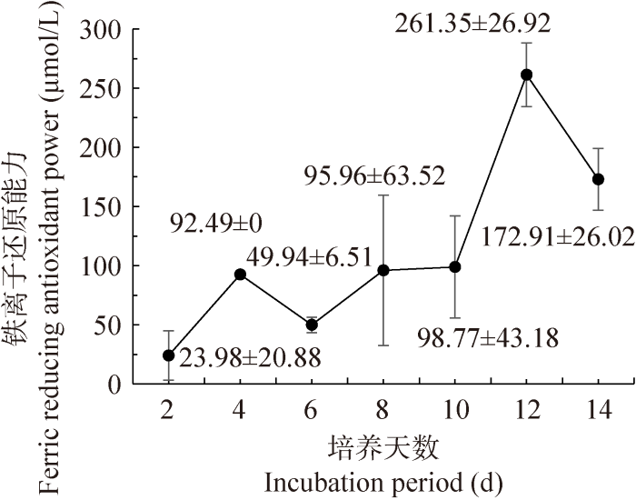 铁离子还原能力(ferric reducing antioxidant power, FRAP)以氧化还原反应比色法为基础,在酸性条件下能抑制某些内源性干扰因素,具有简单快速、重复性好等特点。粗毛纤孔菌在液体培养过程中FRAP值整体上在前12 d呈上升趋势,在第12天达到最大值(261.35±26.92) μmol/L,到第14天又下降(图12),这可能是由于菌株培养后期开始退化,生长代谢变慢导致抗氧化能力也相应降低。