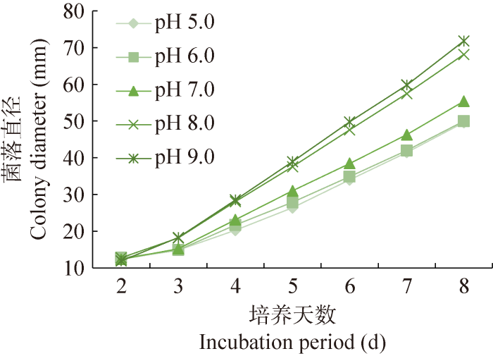 以加富PDA培养基为基础,灭菌前利用提前配制好的1 mol/L HCl和1 mol/L NaOH调节培养基的pH至5.0、6.0、7.0、8.0和9.0,接种后在恒温培养箱中28 ℃黑暗培养。