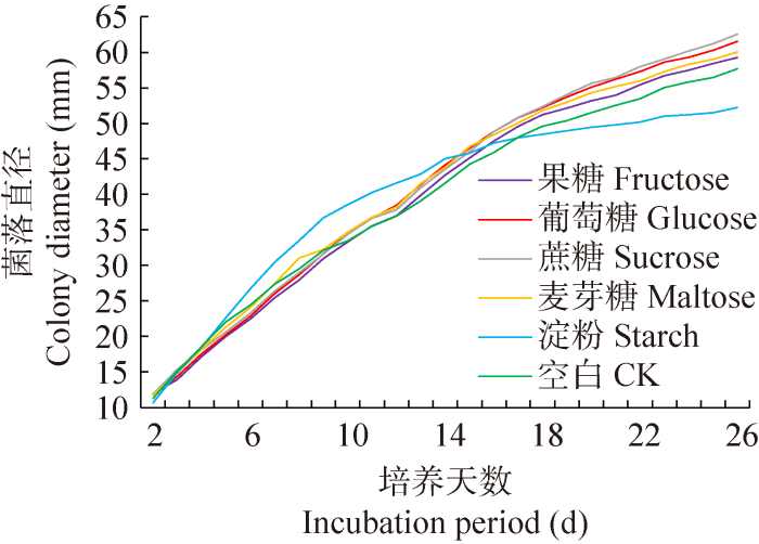 按照无碳源培养基的配方,添加20.0 g/L葡萄糖、果糖、蔗糖、麦芽糖、淀粉及空白碳源对照控制不同碳源来制备培养基,接种后在恒温培养箱中28 ℃黑暗培养。