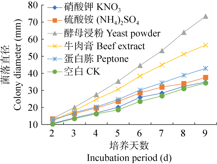 按无氮源培养基的配方,添加5.0 g/L KNO3、(NH4)2SO4、酵母浸粉、蛋白胨、牛肉膏及空白氮源对照控制不同氮源来制备培养基,接种后在恒温培养箱中28 ℃黑暗培养。