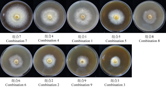 | 培养条件 Condition | 因子 Factor | 菌落直径 Colony diameter (mm) | 显著性 Significance | 菌丝长势 Mycelial growth vigor | |