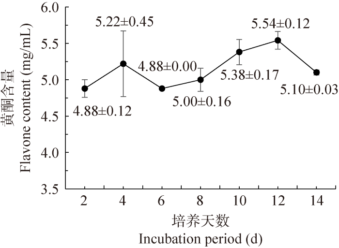 吸取1.0 mL培养液,加6.0 mL 70% (体积分数)乙醇和1.0 mL 5% (质量体积分数) NaNO2溶液,充分搅拌均匀后静置6 min,加1.0 mL 10% (质量体积分数) Al(NO3)3溶液搅拌均匀后继续静置6 min,再加10.0 mL 4% (质量体积分数) NaOH溶液,用70% (体积分数)乙醇定容至25.0 mL,搅拌均匀后静置15 min,在510 nm处测吸光值。用70% (体积分数)乙醇替代反应体系中的培养液,将芦丁标准液分别作为空白和对照,带入标准曲线中以芦丁为当量计算上清液中黄酮类化合物含量。