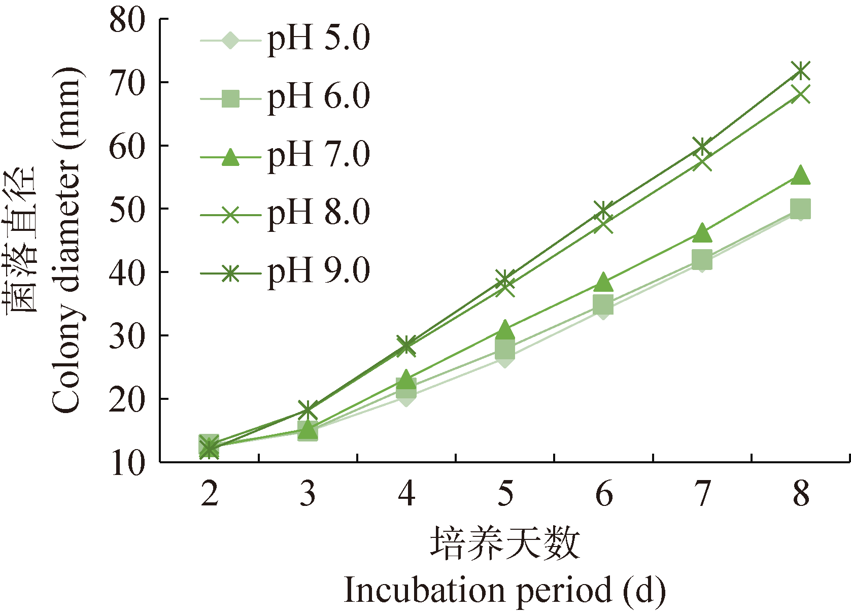 | 图2 粗毛纤孔菌菌落直径在不同初始pH下的生长变化 |