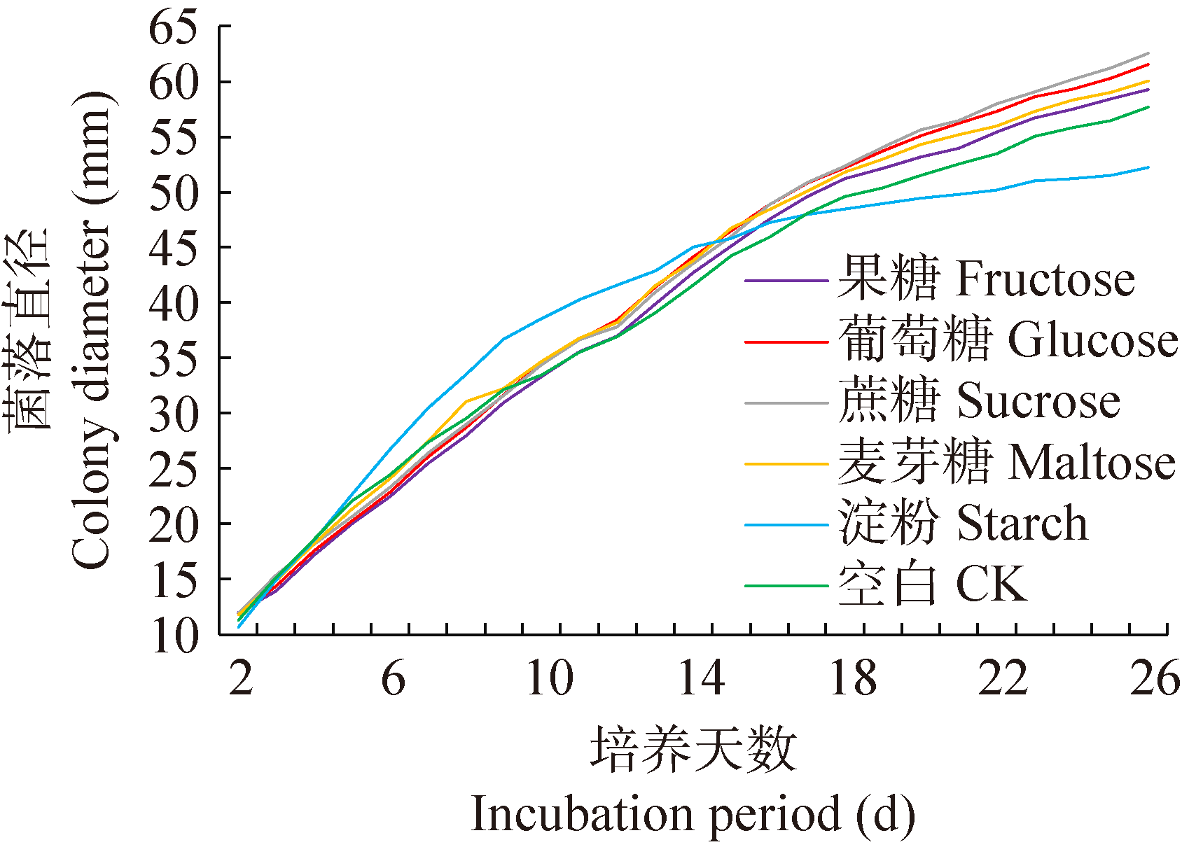 | 图3 粗毛纤孔菌菌落直径在不同碳源下的生长变化 |
