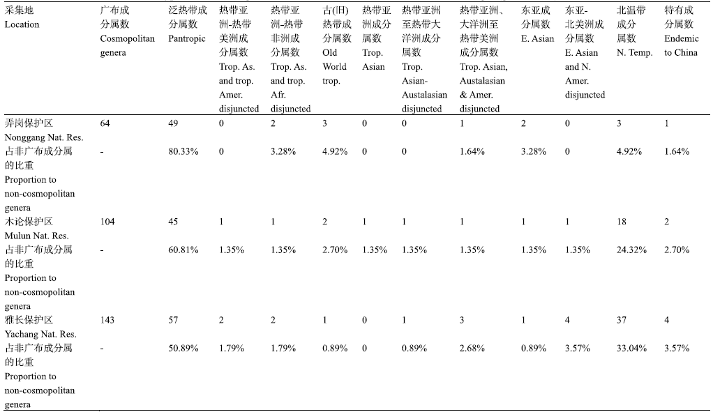 由于当前大型真菌科级水平的分布区划尚未厘清,也未形成统一的区划认识,本研究仅简单将其划分为广布成分、泛热带成分和北温带成分。