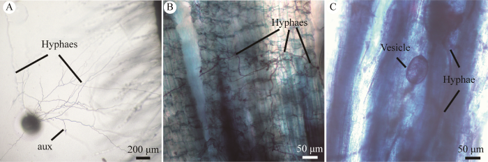 将单物种培养和离体培养所获得的根剪成0.5-1.0 cm,利用醋酸-墨水改良染色法(Vierheilig et al. 1998)进行染色。软化:将根样装入试管中,加入10%氢氧化钾溶液没过根样,90 ℃水浴10-15 min,至根样软化褪色,自来水缓慢冲洗,完全去除根样中的氢氧化钾。漂白:上述根样中加入20%的H2O2溶液,室温下静置30 min,自来水漂洗后,放置于新试管中。酸化:加入5%乙酸溶液酸化5 min,倒掉乙酸溶液。染色:加入含有5%醋酸-墨水染液(95 mL的5%醋酸+ 5 mL的Sheaffer Skrip蓝墨水),66 ℃水浴20- 30 min。脱色:倒掉染液,蒸馏水冲洗,根样浸泡在清水中进行褪色处理12 h,制片观察。